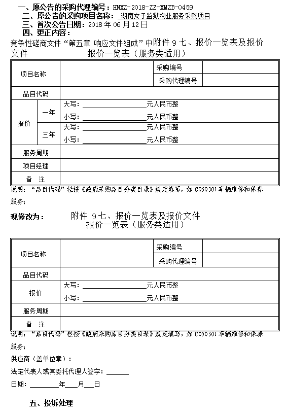湖南女子監(jiān)獄物業(yè)服務(wù)采購項(xiàng)目競爭性磋商更正公告