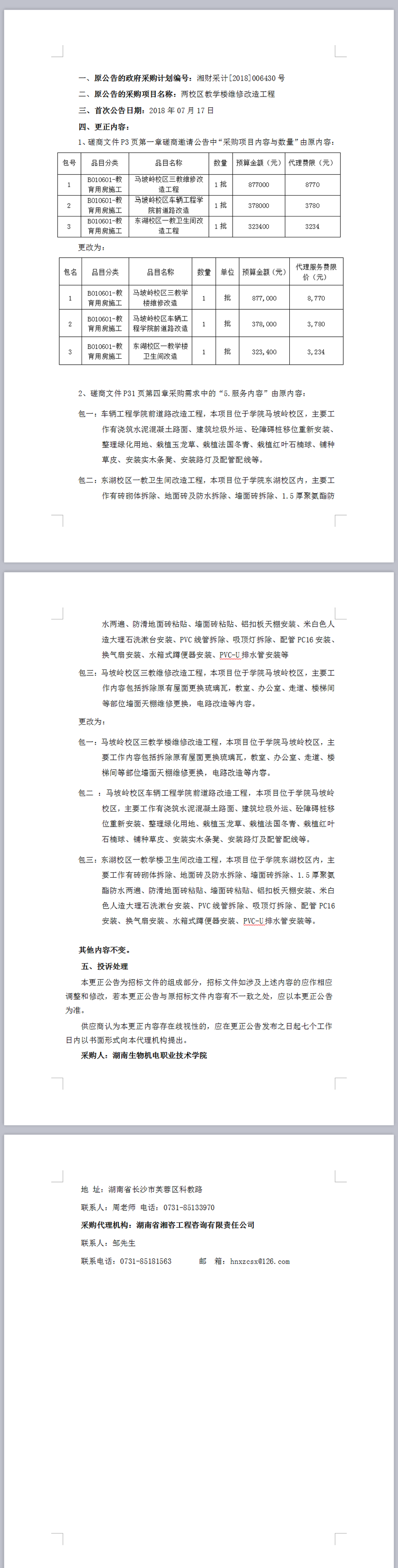 湖南生物機電職業(yè)技術(shù)學院兩校區(qū)教學樓維修改造工程項目競爭性磋商更正公告