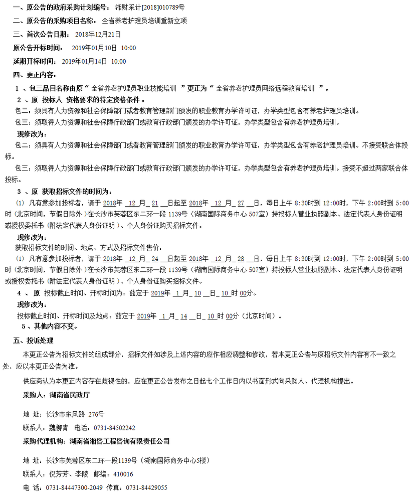 湖南省民政廳全省養(yǎng)老護理員培訓(xùn)重新立項項目公開招標更正公告