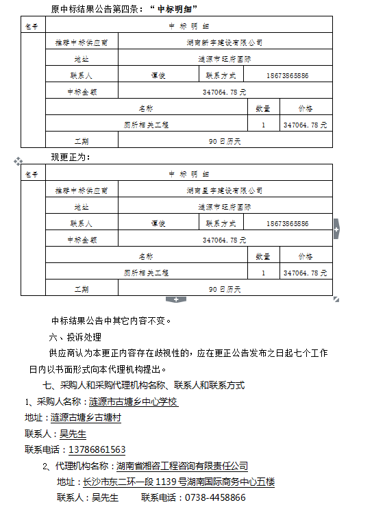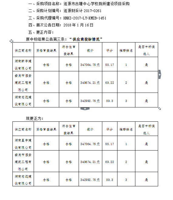 漣源市古塘中心學(xué)校廁所建設(shè)項(xiàng)目采購(gòu)中標(biāo)結(jié)果更正公告