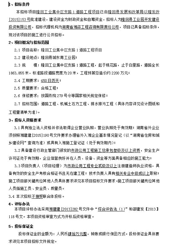 隆回工業(yè)集中區(qū)支路1道路工程項目招標(biāo)公告